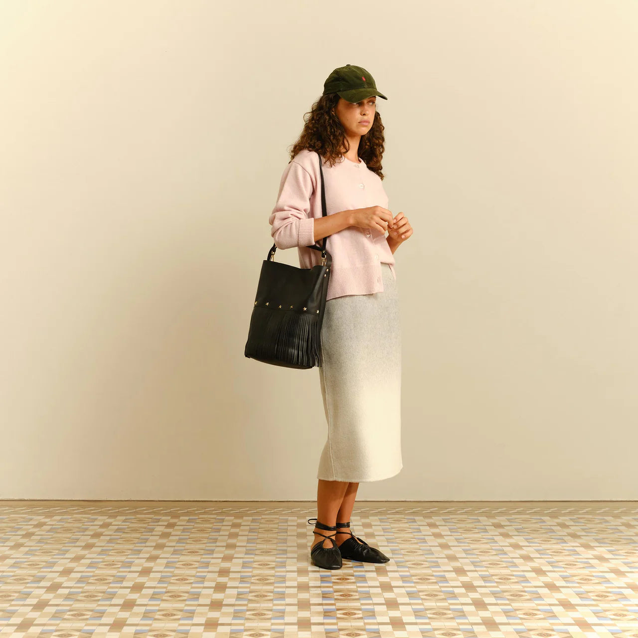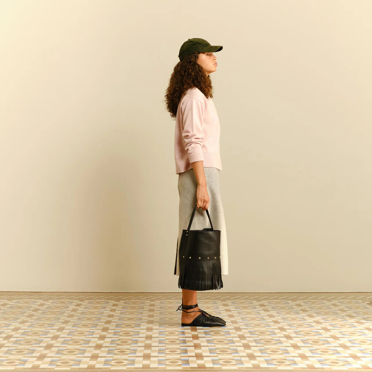 El Bucket Fringes es un bolso ligero con gran capacidad; cuenta con 2 asas, una fija superior para llevar al hombro o en la mano y una más larga para poder llevarlo colgado o cruzado.