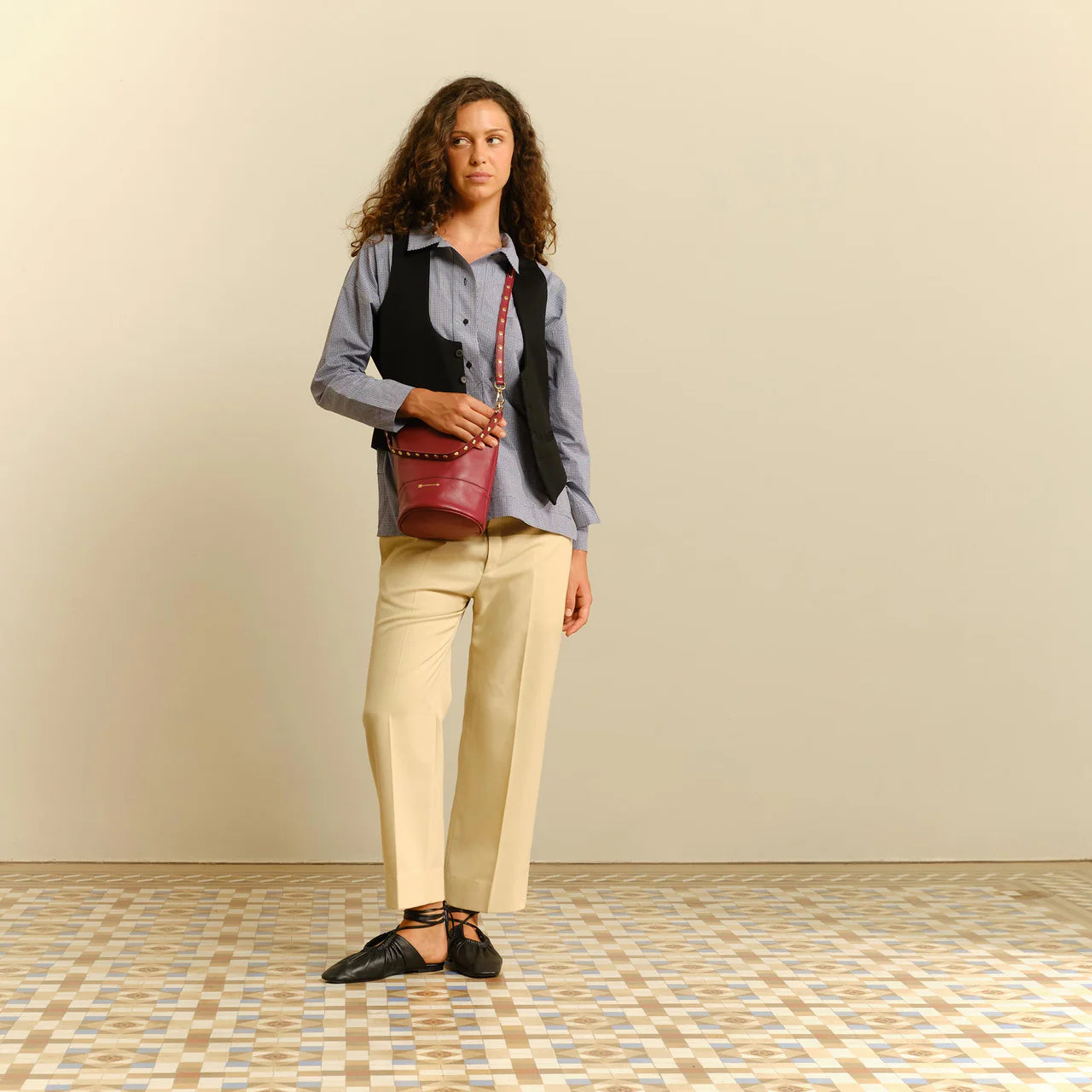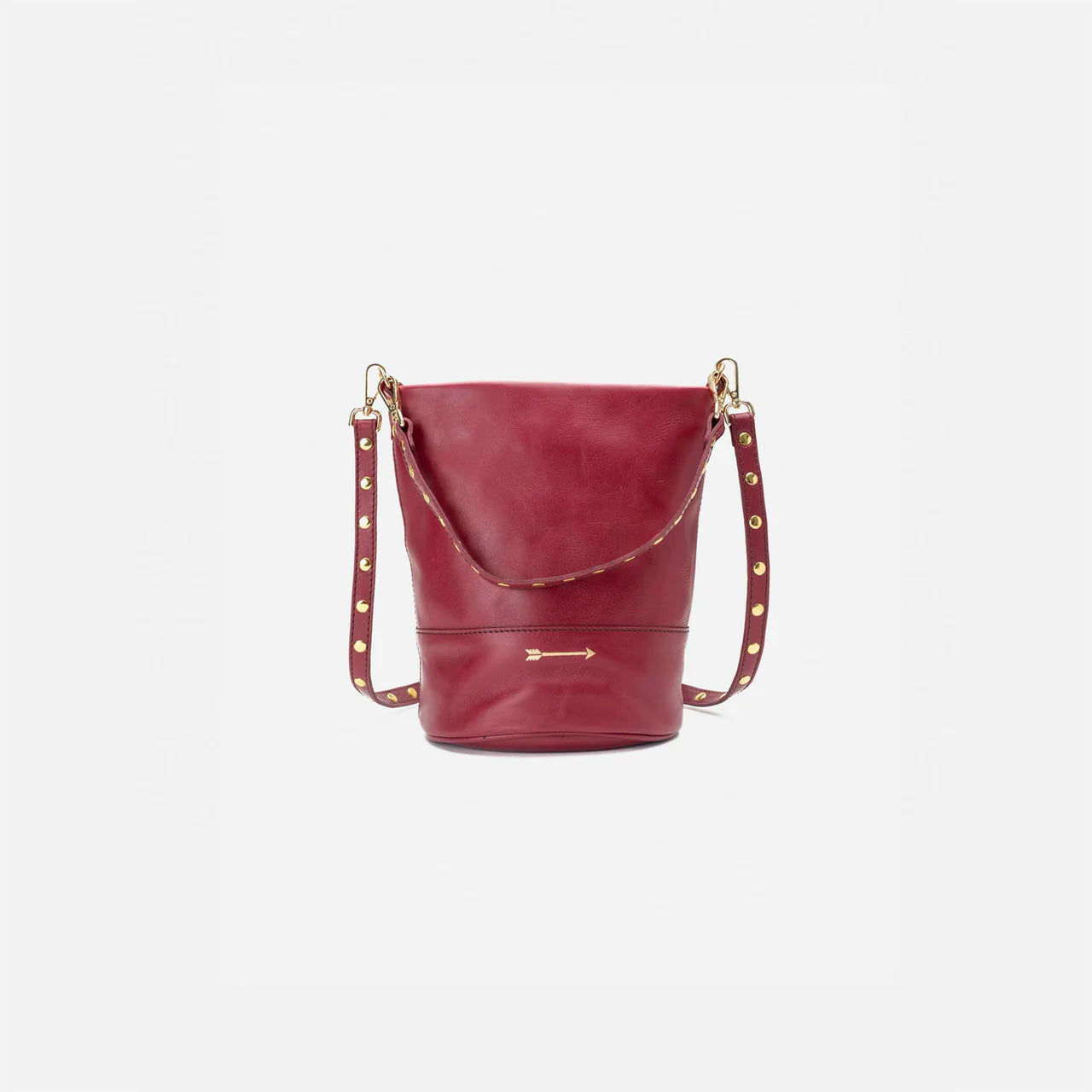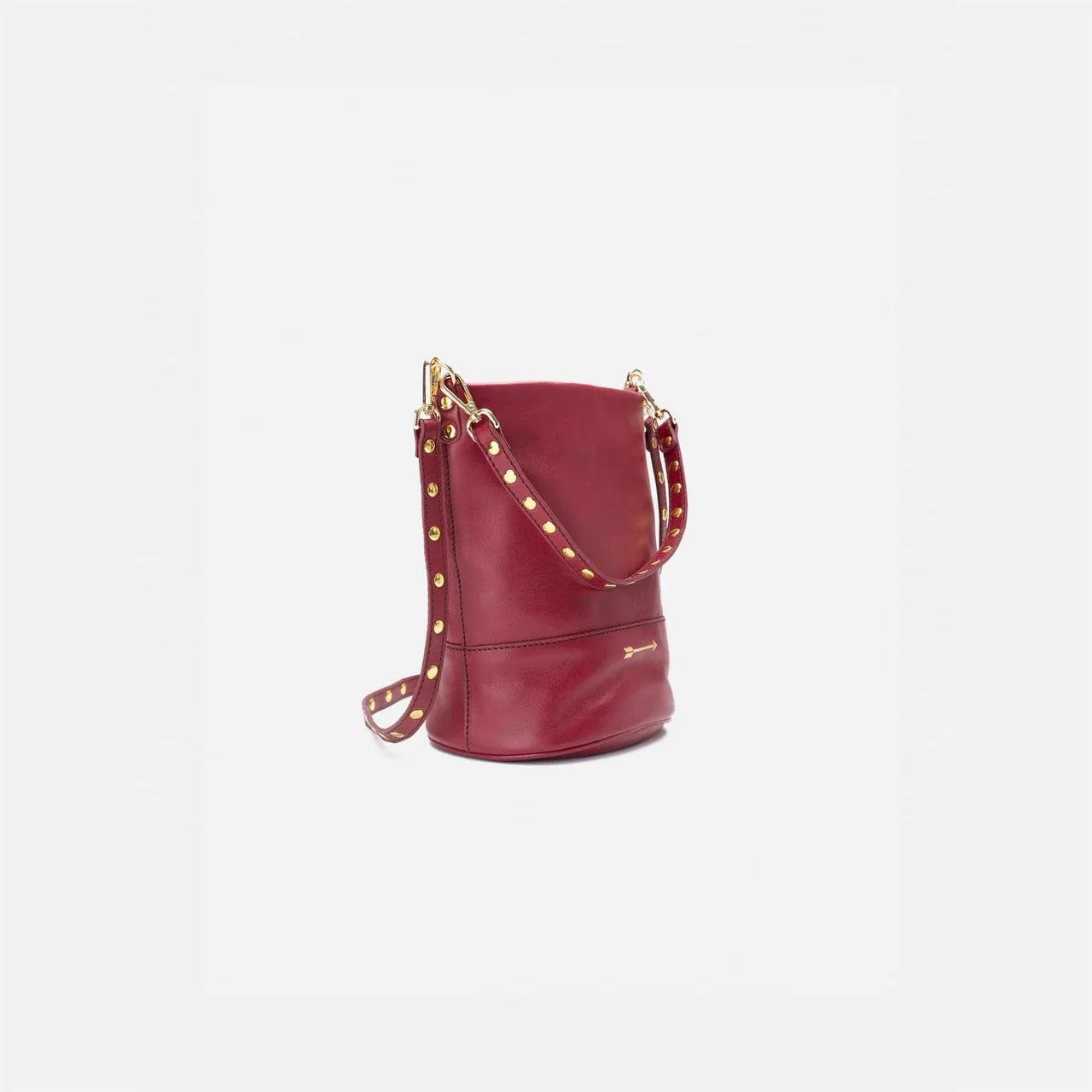 Bolso cubo mediano de piel con dos asas desmontables con remaches: una corta para llevarlo al hombro o en la mano y otra larga para llevarlo como bandolera.