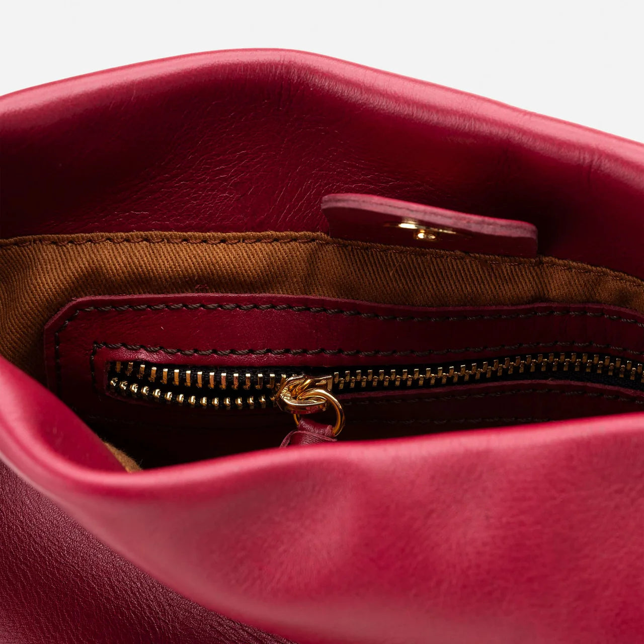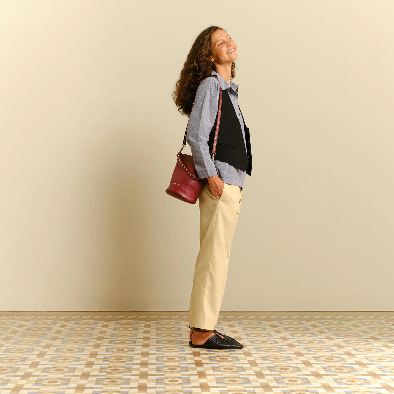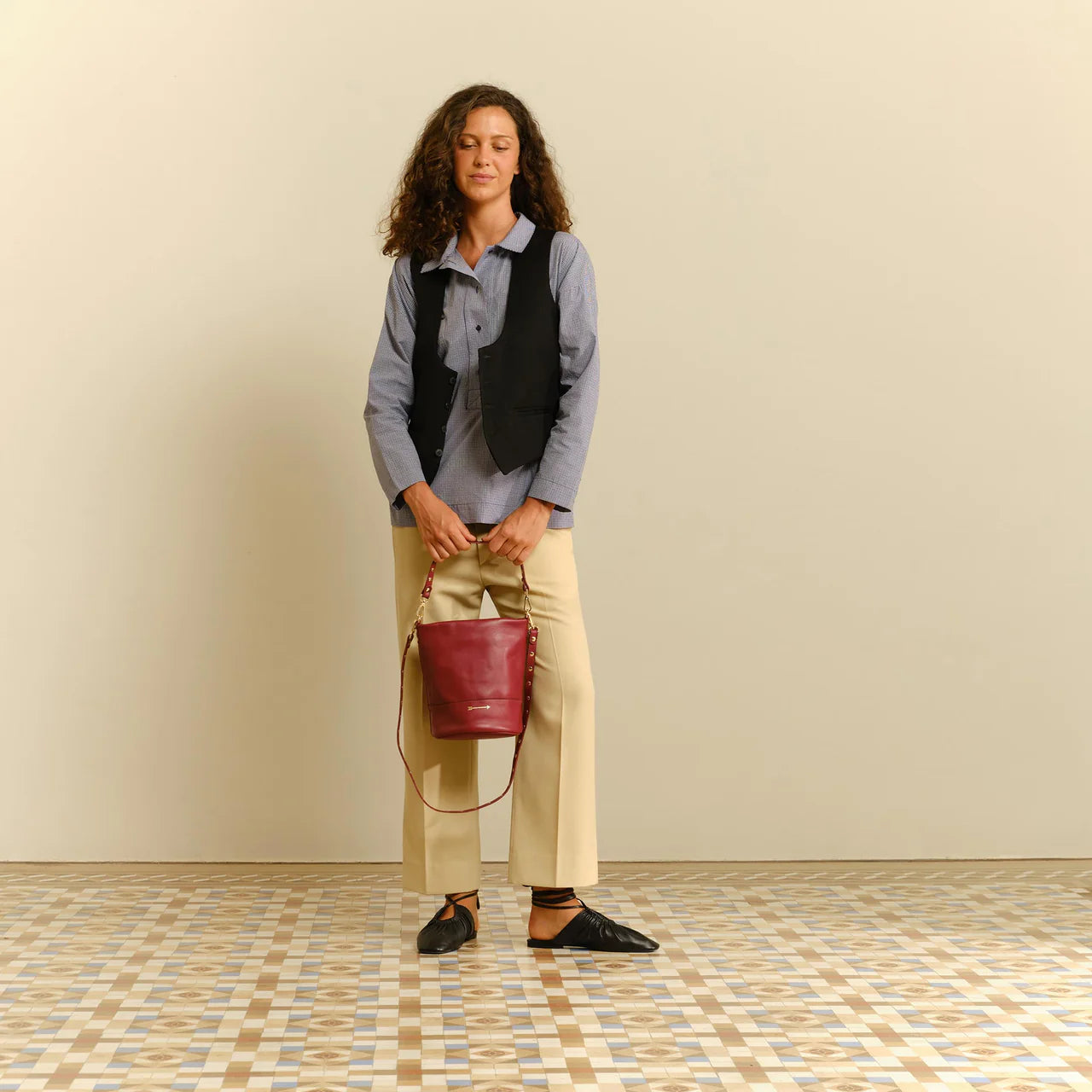 Bolso cubo mediano de piel con dos asas desmontables con remaches: una corta para llevarlo al hombro o en la mano y otra larga para llevarlo como bandolera.
