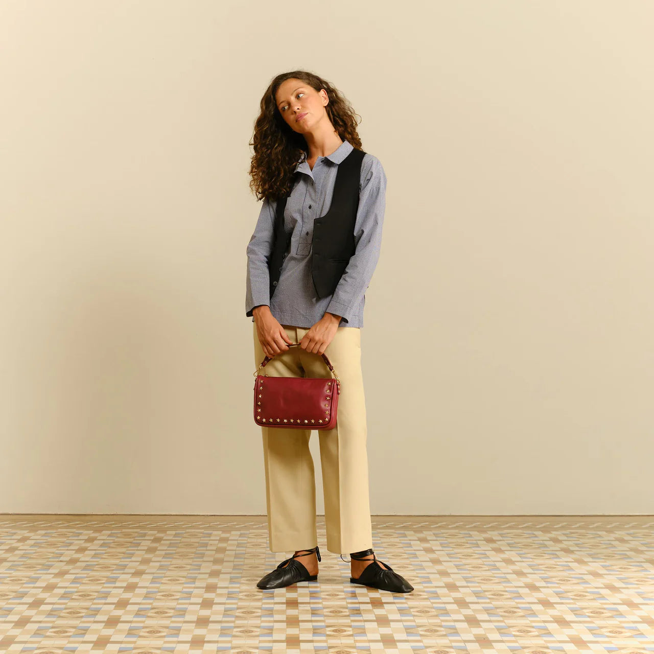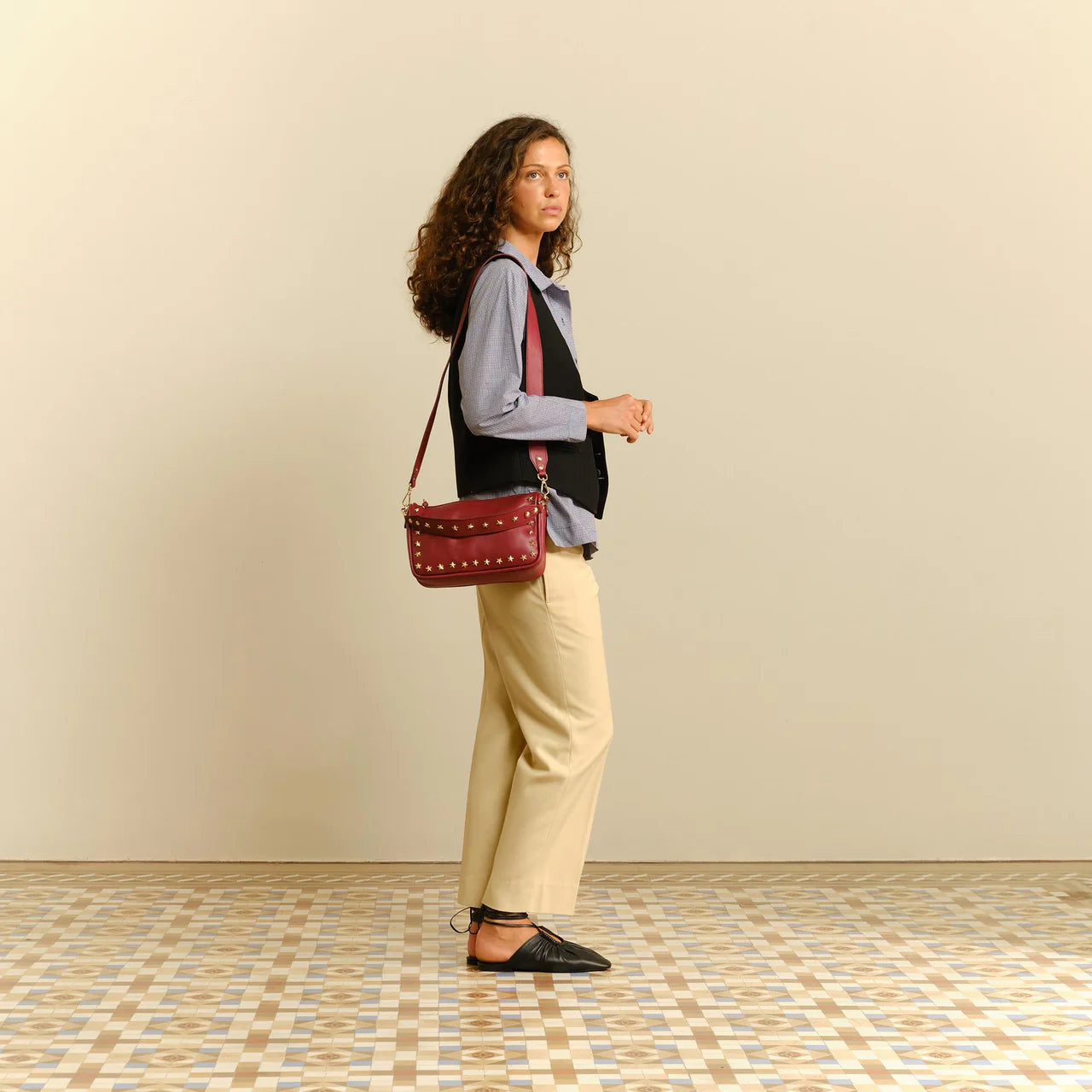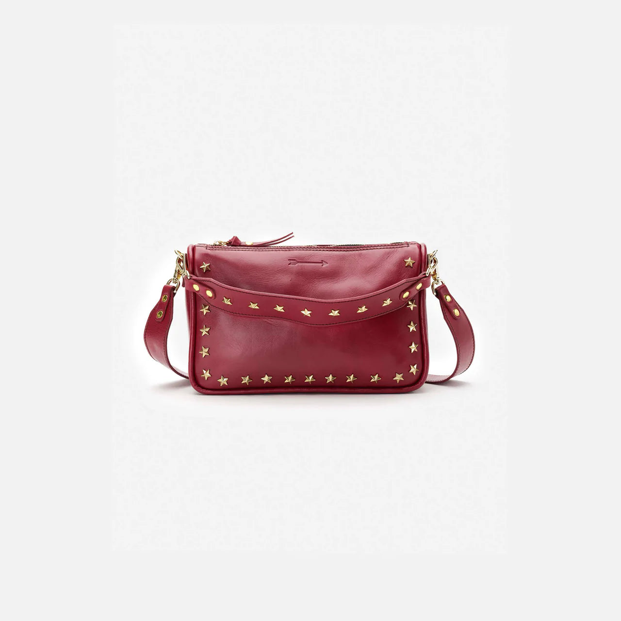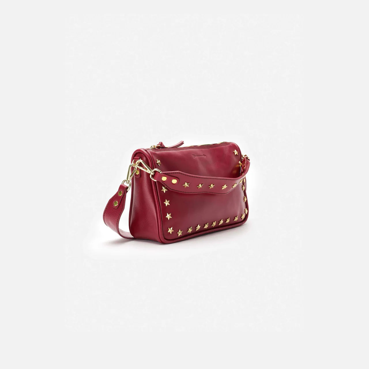 Bolso mediano rectangular con estrellas en la parte frontal. Cuenta con 2 asas desmontables, una corta con estrellas para llevar el bolso en la mano y un asa larga lisa para llevarlo al hombro o cruzártelo cómodamente.