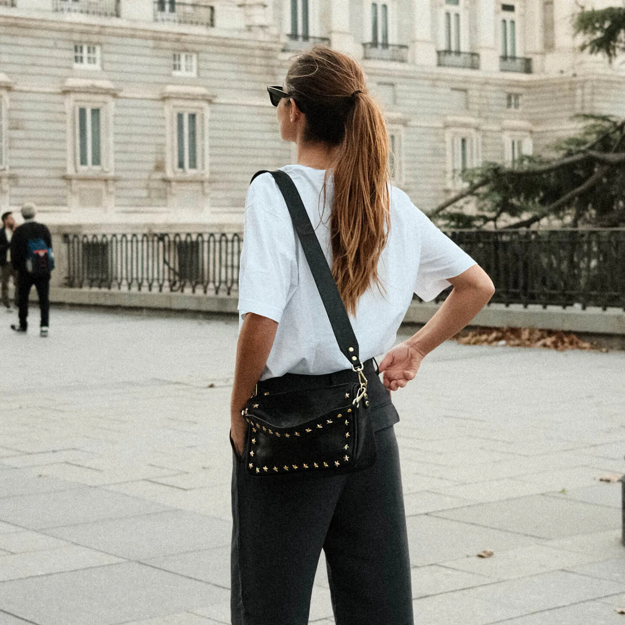 Bolso mediano rectangular con estrellas en la parte frontal. Cuenta con 2 asas desmontables, una corta con estrellas para llevar el bolso en la mano y un asa larga lisa para llevarlo al hombro o cruzártelo cómodamente.
